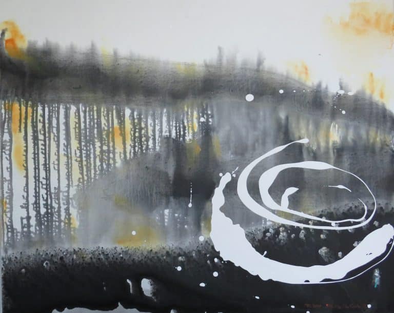 Seul l’artiste, en ce silence assourdissant parvient encore à donner voix et figure à la complainte des éléments. Ce sont tout d’abord les oiseaux qui nous accueillent comme si de rien n’était, déchirant de leur couleurs le voile du monde et de notre impassibilité. Peu à peu leur milieu semble les absorber, les dévorer. De mystérieux lazzis blancs, des manières de ricanements spatiaux du paysage, surgissent. Puis ce sont les arbres qui viennent à hurler leurs avertissements colorés avec au bout du compte des panaches enflammés. Ils ont ensuite tendance à céder la place à leurs propres ombres, décharnées, à être entraînés dans une danse macabre, tel un vortex les conduisant à l’abîme. Des ocres de terre mêlés à la brume apparaissent encore. Mais le mouvement est d’ores et déjà ailleurs. Il les emporte dans une sorte de vortex irrésistible vers la noirceur des profondeurs. Il ne s’agit pas d’un simple glissement de terrain tels ceux que produisent désormais de façon récurrente des précipitations fluviales qui se comportent comme des torrents de laves froides, ou plus discrètement la fonte du pergélisol entrainant la chute de rochers lacérant et déchirant jusqu’à la structure du sol, mais d’un dérapage du monde lui-même, d’un dérapage cosmique, du retour du monde commun aux vivants au chaos des origines, aux abysses d’avant la vie. Les volutes blanches, en réalité indemnes de formes, et donc de vie, tracent désormais des cercles délétères de plus en plus vastes et alertes qui embrassent la totalité des paysages et des toiles. Il n’est pas question de gravitation, d’attraction des planètes les unes vers les autres pour ménager la stabilité d’un ordre cosmique, mais d’attraction du néant, de dévastation dynamique. Les mouvements d’un gigantesque serpent cosmique se dessinent. Ce n’est plus le reptile divin des récits amérindiens qui accouche du monde, mais celui trop humain de nos propres activités, de notre insatiabilité de ressources, de notre puissance technique qui détruit et dévore le monde au lieu de le produire.